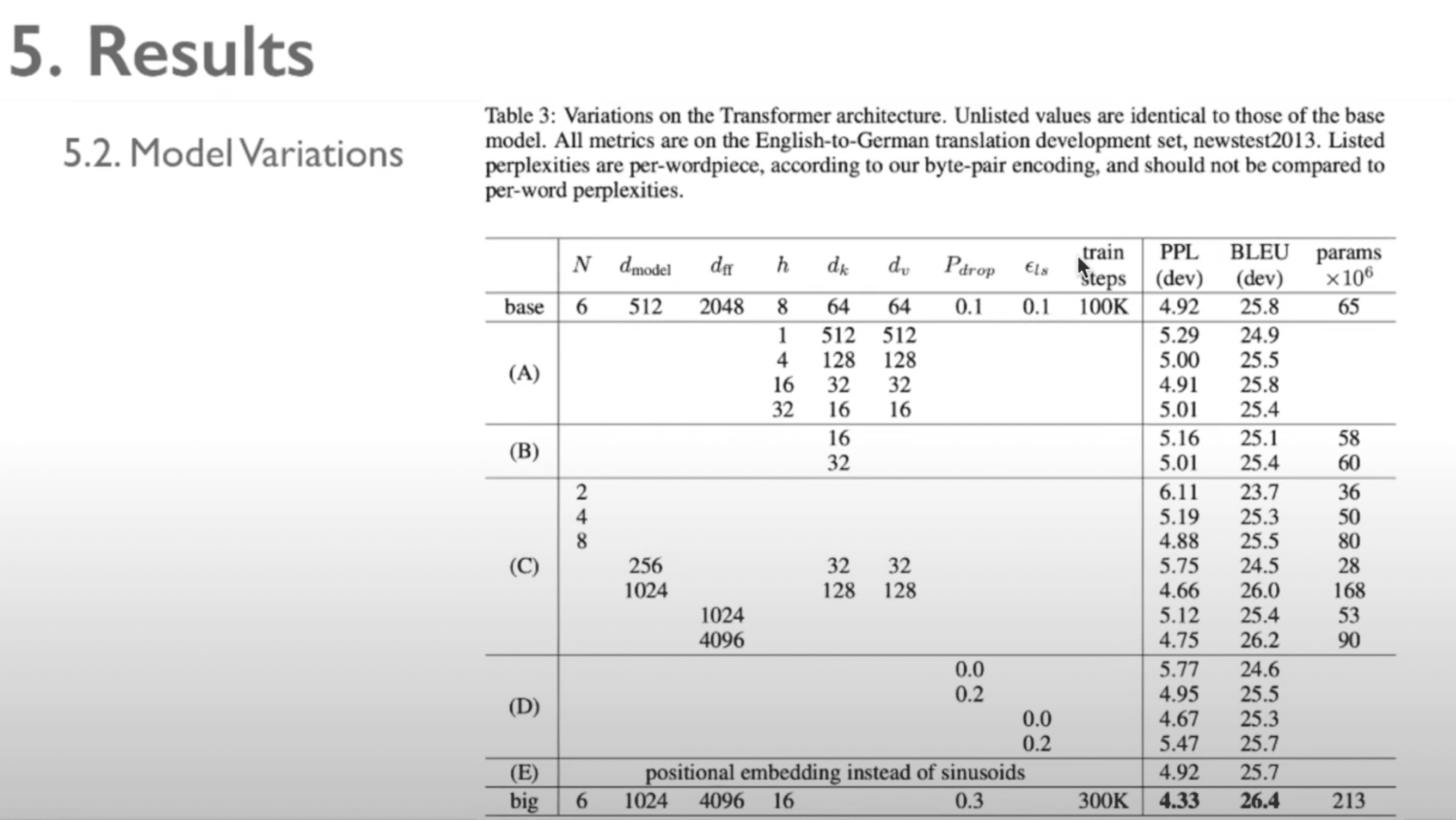 Model Variation은, base와 비교했을 때, (B)는 key dimension을 변경한 것입니다. 어텐션 key의 size가 모델에 어떻게 미치느냐를 확인한 것이고, 여기서는 dot product가 필요하고, 성능을 향상할 수 있다는 것을 보여줍니다. (C)는 모델 크기에 따른 영향을 알 수 있습니다. 그래서 256과 1024 비교를 한 것을 확인할 수 있습니다. (D)는 dropout의 유무에 따른 성능 차이도 확인할 수 있습니다. (E)에서는 sinusoid 대신에 positional embedding을 사용했고, 결과적으로 베이스와 유사한 결과가 나오는 것을 확인할 수 있습니다.