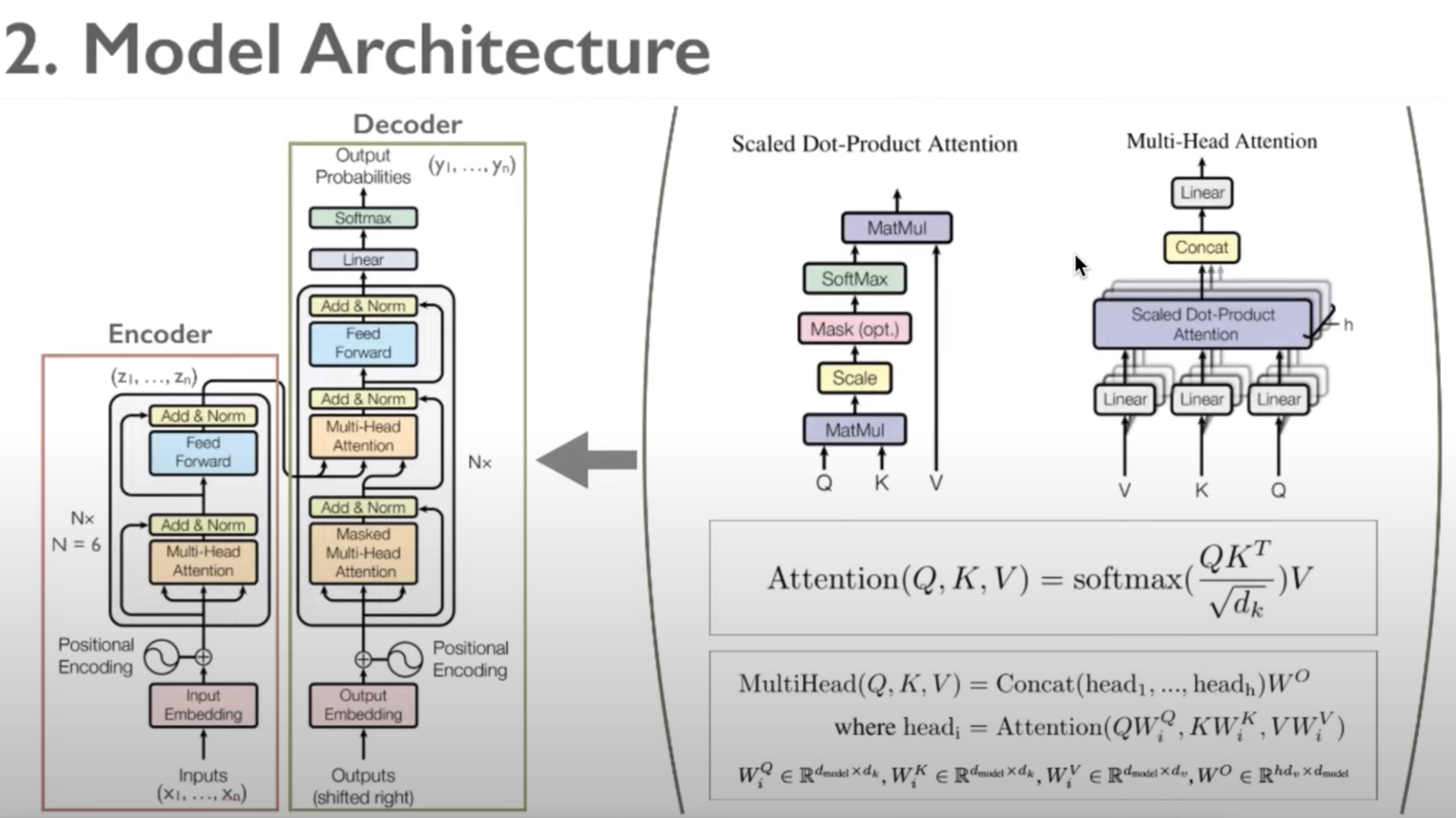 Encoder는 일단 총 6개의 레이어로 구성되어 있습니다. 그리고 모든 레이어는 같은 서브 레이어를 갖고 있습니다. 먼저 서브 레이어에는 총 두 개의 레이어를 지니고 있습니다. 그리고 그전에 앞서서 이때 Encoder의 input과 output은 512 dimension을 가지고, 이것은 이후에 디코더에 사용되는 일부 key라든가 value 때문에 512로 지정이 되어 있습니다. 먼저 왼쪽 그림의 Multi-Head Attention부터 보겠습니다.