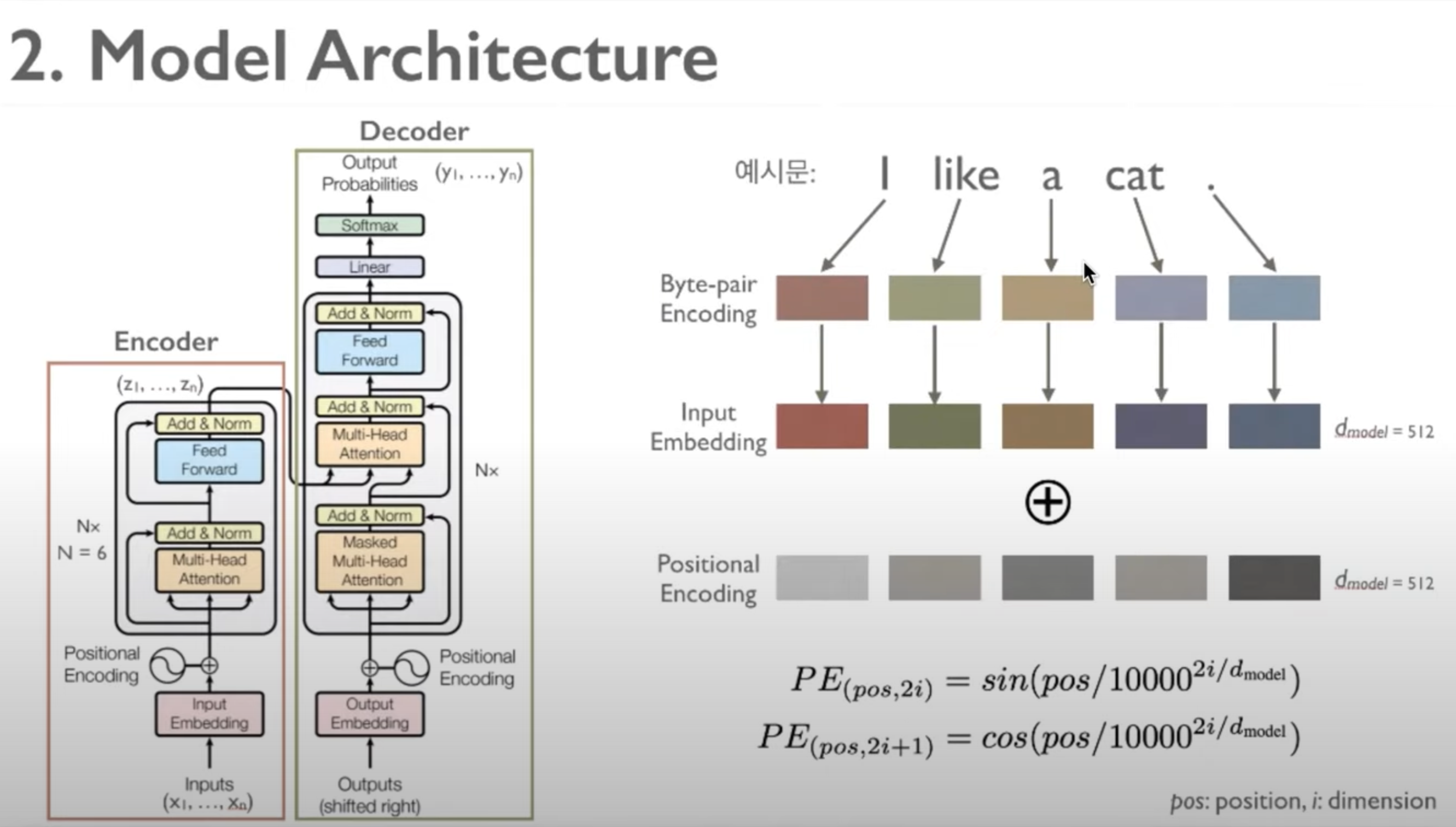 오른쪽 그림에서 ‘I like a cat’ 라는 input을 예시문으로 들겠습니다. 여기에서는 Byte-pair Encoding을 해서 특징을 컴퓨터가 계산할 수 있게 만들었다고 할 수 있을 것 같습니다. 그리고 이것은 Input Embedding을 거치게 되고, 이때의 dimension은 512로 계속 고정이 될 것입니다. 그리고 Input Embedding의 경우에는 Positional Encoding과 concatenation이 됩니다. 이 Positional Encoding의 경우에는 예전에는 one-hot encoding을 이용해서 바이너리로 한 반면에, Transformer에서는 더 위치 간 정보를 강조했다고 할 수 있을 것 같습니다.