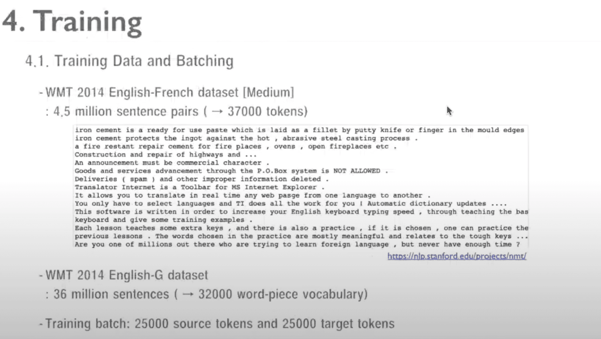 위 자료는, training때 사용한 데이터를 설명한 것입니다. 여기서는 English-French dataset을 이용하였고, 또한 English-German dataset을 사용하였습니다.