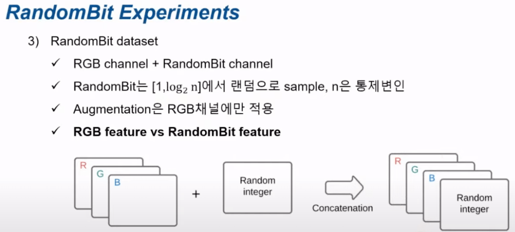 마지막은 RandomBit 실험입니다. RGB 3 채널의 데이터에다가 RandomBit의 채널을 추가해서 총 4 채널이 데이터를 만들어 SimCLR에게 학습시키는 실험입니다. RandomBit는 1에서 log 2n 중에 랜덤으로 sampling 하는 값이고 n은 통제할 수 있는 통제 변인입니다. 다음으로 학습 시에 Augmentation은 RGB채널에만 적용하고 RandomBit 채널에는 적용하지 않습니다. 왜냐하면 RandomBit 채널이 두 개의 Augment 된 view가 있을 때 두 개의 view에 공통적으로 동일한 RandomBit 채널이 들어가게 함으로써 Competing 관계를 RGB feature랑 RandomBit feature로 만들기 위해서 RGB 채널에만 Augmentation을 적용했습니다.
