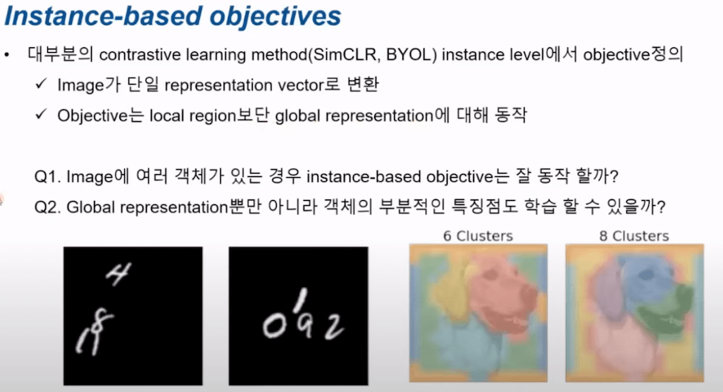 이미지에 여러 객체가 있을 때 과연 Contrastive learning은 학습을 잘할 수 있을지 알아봤습니다. SimCLR 그리고 BYOL 모두 instance level에서 object를 정의를 하고 학습을 진행합니다. 그래서 이미지가 단일 representation vector로 변환이 되고, 즉 local region을 측정하지 않고 global representation에 대해서 동작합니다. 여기에서 두 가지 의문점이 제기가 됩니다. 첫 번째, 이미지 안에 여러 개의 객체가 있는 경우에 Contrastive learning은 잘 동작을 할 것인가, 두 번째, global representation 뿐만 아니라 객체에 부분적인 특징점들도 잘 잡아낼 수 있을 것인가입니다.