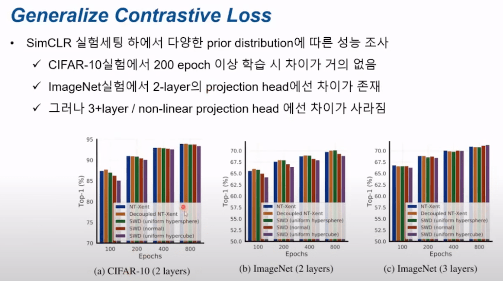 논문 내용은 Contrastive loss로 학습시켰을 때 나타나는 세 가지 특성입니다. 첫 번째 특성 같은 경우에는 Contrastive loss를 일반화한 후에 그로부터 나오는 여러 종류의 Contrastive loss 패밀리들의 성능은 어떻게 나오는가에 대한 내용입니다.