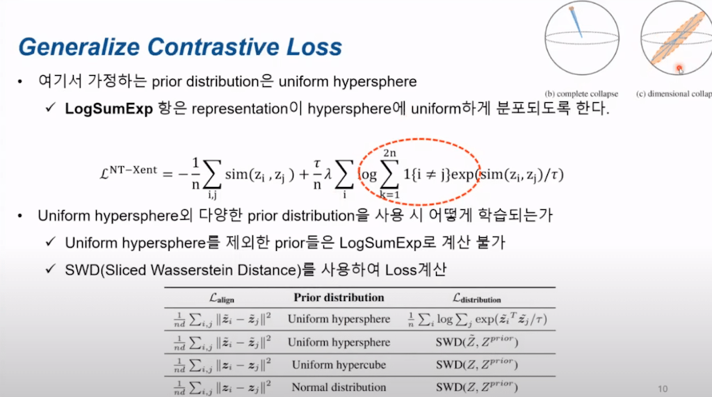 두 번째 항은 uniform hypersphere를 엔트로피 prior distribution으로 가정을 해서 단순 log sum exp항을 사용하였습니다. 이 항을 minimize 함으로써 entropy를 높이면 representation들이 uniform 하게 분포하게 되고 다양한 정보를 담을 수 있습니다. 만약에 두 번째 항이 제대로 minimize이 되지 않는다면 오른쪽 위 그림처럼 모든 차원의 feature들이 분포하지 않고 낮은 차원에만 존재하게 되면서 차원 붕괴 현상이 발생을 하고 성능이 낮아지는 현상이 벌어지게 됩니다.