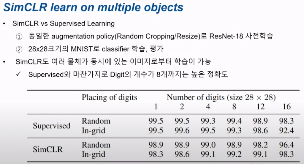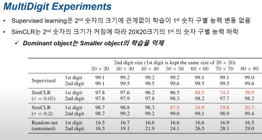 결과입니다. supervised learning의 경우 크기가 변동하는 두 번째 숫자에 크게 관계없이 첫 번째 숫자에 대한 구별 능력이 변동이 없어서 높은 정확도를 보이게 됩니다. 반면에 SimCLR 같은 경우에는 두 번째 숫자의 크기가 커질수록 작은 크기 20 x 20 크기 첫 번째 숫자에 대한 구별 능력은 현저하게 하락을 하게 됩니다. 첫 번째 행, supervised 경우에는 첫번째 두번째 숫자 모두 다 99% 이상의 정확도를 보여주는 반면에 두번째 세번째 항 SimCLR 같은 경우에는 두 번째 숫자의 크기가 커지면 커질수록 첫번째 Digit에 대한 구별 능력은 현저하게 떨어집니다. 그래서 거의 Random 네트워크의 성능에 비슷할 정도로 떨어지게 됩니다. 이를 통해서 Contrastive learning은 이미지 안에서 Dominant 한 물질, 좀 큰 물체가 작은 물체의 학습을 방해한다 라는 것을 알 수 있습니다.