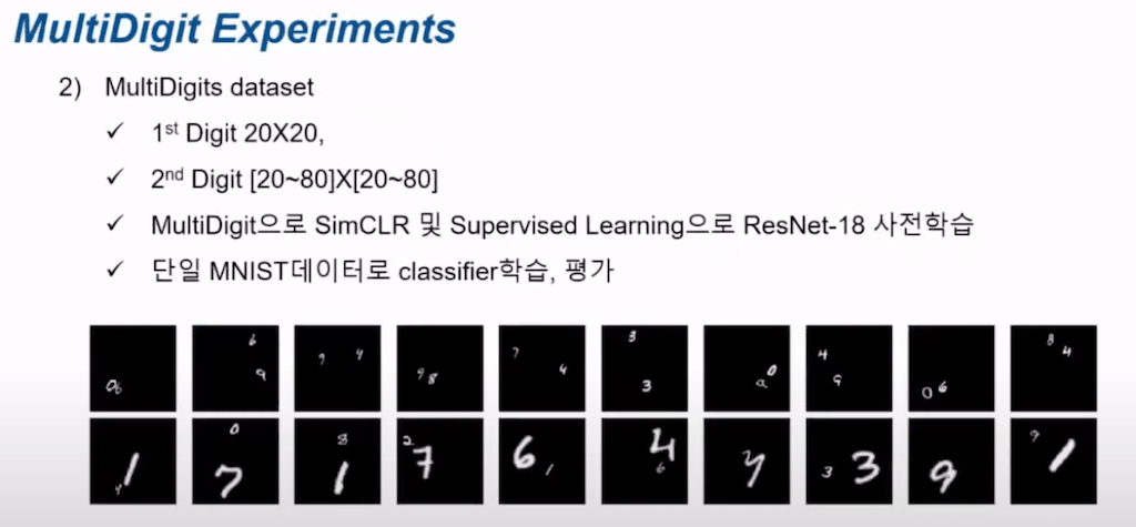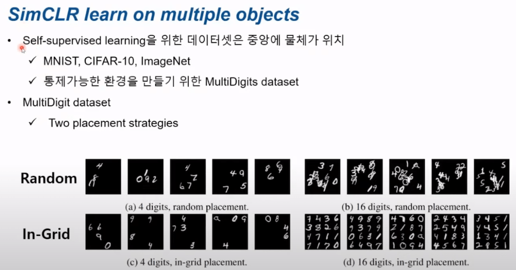 SimCLR를 통해서 객체가 여러 개인 경우 학습이 되는지 알아보도록 하겠습니다. 보통 self-supervised learning을 할 때 가장 많이 쓰이는 데이터셋들이 MNIST, CIFAR-10 그리고 ImageNet이 있습니다. 이 경우들은 모두 학습하려는 물체가 중앙에 위치해 있습니다. 그래서 본 논문에서는 객체가 여러 개인 통제 가능한 환경을 만들기 위해서 새로운 MultiDigit이라는 데이터셋을 만들었습니다. MultiDigit은 MNIST 데이터셋을 여러 개 합쳐 만든 데이터셋입니다. 각 데이터에 크기는 112 X 112 사이즈고 다만, 숫자들을 어떻게 이미지에 배치할 것인가에 따라서 두 가지 strategy가 있습니다. 첫 번째로 Random입니다. 숫자들을 랜덤 한 위치에 배치하는 경우입니다. In-Grid는 4 X 4의 격자를 만들어서 격자 중에 랜덤 하게 배치하는 경우입니다.