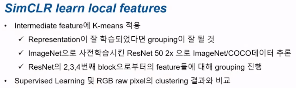 이를 알아보기 위해서는 SimCLR로 학습시킨 네트워크의 중간 피쳐들, Intermediate feature들에 대해서 K-means를 적용시켜서 visualization을 진행했습니다. 만약에 SimCLR가 지엽적인 feature들을 잘 잡아낸다면 그림의 비슷한 부분끼리 grouping이 잘 될 것으로 예상을 할 수 있습니다. 그래서 학습은 ImageNet으로 사전 학습한 ResNet 50 2x로 ImageNet 그리고 COCO 데이터들을 추론을 했고, ResNet의 2, 3 ,4번째 block뒤에 나오는 피쳐들에 대해서 grouping을 진행했습니다. 그리고 supervised learning 및 RGB raw pixel에 대한 clustering 결과와 비교를 진행했습니다.