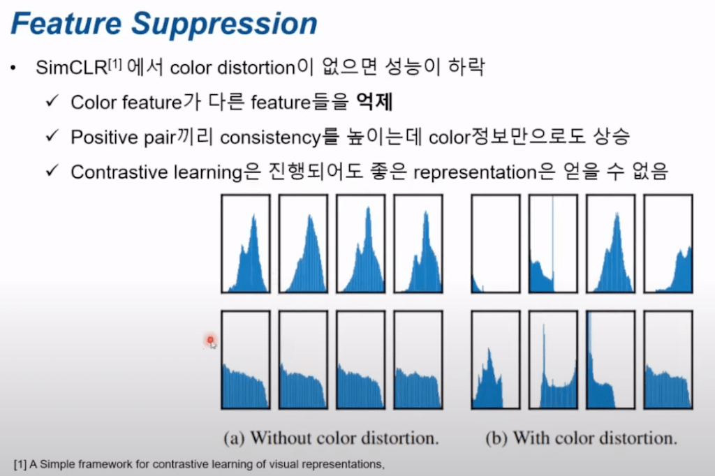 Contrastive learning에서 알고자 한 특성. feature suppression에 대해서 설명드리겠습니다. SimCLR애 서 Augmentation이 매우 중요한 요소입니다. 특히 Color Augmentation 없이 학습을 진행할 경우에는 성능이 크게 하락합니다. 만약에 컬러 데이터에 어떠한 왜곡 또는 Augment 없이 학습시키는 경우에 Consistency를 높이기 쉬운 컬러 정보만을 학습하게 되고, 이로 인해 다른 피처들은 학습되지 않습니다. 그래서 이 컬러라는 피쳐가 다른 피쳐들을 억제한다고 하여 feature suppression이라고 합니다. 그림 (a) 위아래 모두 각각 한 장 이미지로부터 Cropping을 한 뒤의 컬러 히스토그램입니다. 데이터 간 Consistency로 높이는 Contrastive learning의 특성상 다 positive pair인데 단순히 컬러 분포만 가지고도 같은 이미지로부터 나온 건지, 서로 다른 건지 알 수 있습니다. 그래서 나머지 컬러만 가지고 구별한 Positive 그리고 Negative를 구별한 것이 가능하기 때문에 컬러 이외에 다른 피쳐들은 굳이 학습하지 않아도 Contrastive learning이 진행이 되고 loss는 감소합니다. 반면에 Color Distortion을 진행을 했을 때는 그림 (b)처럼 컬러 피처만으로는, 컬러 히스토그램만 가지고는 서로 positive인지 negative인지 알 수 없습니다. 따라서 이제 컬러 정보 외에 다양한 정보들을 학습할 수 있게 됩니다. 이러한 현상을 feature suppression이라고 하고, 이때 color feature와 object class는 competing feature 관계에 있다고 말합니다.