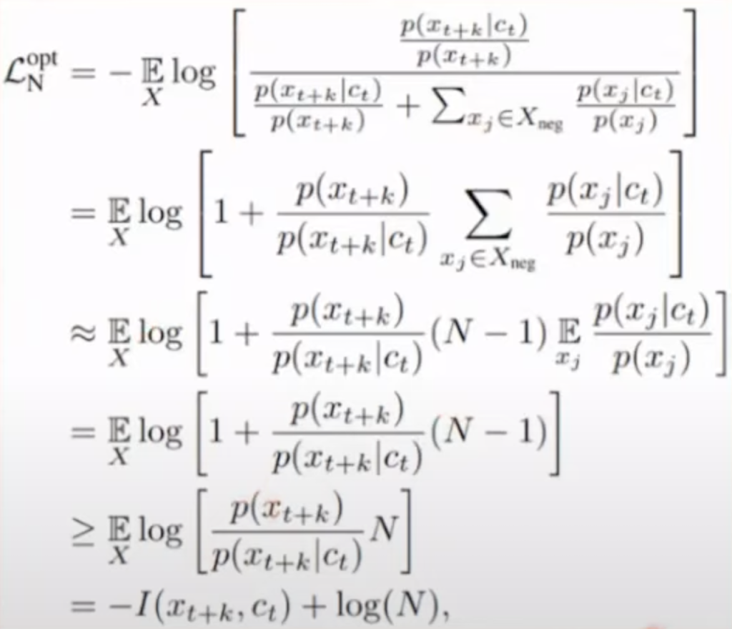 맨 아래 식에서 negative sample들이 개수가 증가하면 Mutual Information이 low boundry를 높이게 되고 더 좋은 representation을 얻을 수 있게 됩니다. 그래서 배치 사이즈를 SimCLR에서 엄청나게 크게 잡는 이유이기도 합니다.