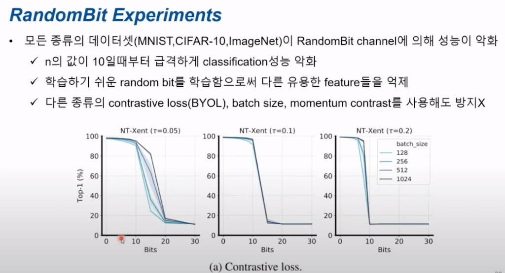 결과입니다. RandomBit의 크기를 통제하는 n의 값이 10 부근부터 급격하게 SimCLR의 성능이 낮아지게 됩니다. 즉 RGB 채널에 있는 모든 정보들을 무시하고 positive pair에 공통적으로 들어가 있는 RandomBit channel 단위 Consistency만을 높이도록 학습이 진행되어서 RGB 데이터의 정보는 모두 다 무시되는 것으로 이해할 수 있습니다. 이런 현상은 다른 Contrastive loss인 BYOL를 쓰고 다른 다양한 배치 사이즈를 제공시켜 보고 momentum contrast를 사용하더라도 계속해서 동일한 현상이 발생하는 것을 확인했습니다.