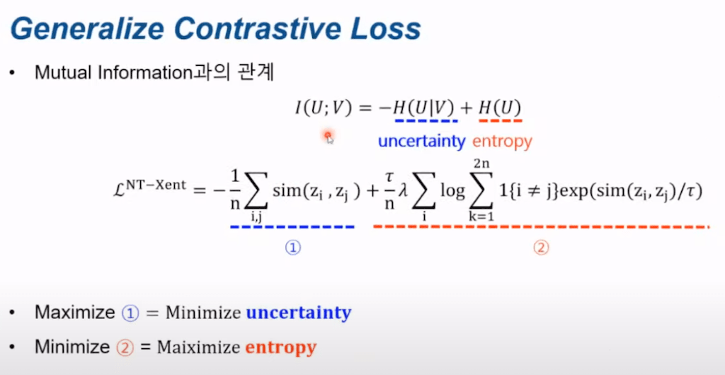 Contrastive loss는 Mutual Information 하고도 연관이 있습니다. latent variable U 그리고 V Mutual Information 식입니다. Mutual Information은 uncertainty 그리고 entropy로 이루어져 있습니다. Contrastive loss의 첫 번째 항에서 두 view의 similarity를 증가시키는 것은 두 latent variable U와 V uncertainty를 줄이는 것과 같다고 볼 수 있습니다. 두 번째 항에서 다른 모든 view와의 similarity를 감소시키는 것은 Mutual Information에서 entropy를 높이는 것으로 이해할 수 있습니다.