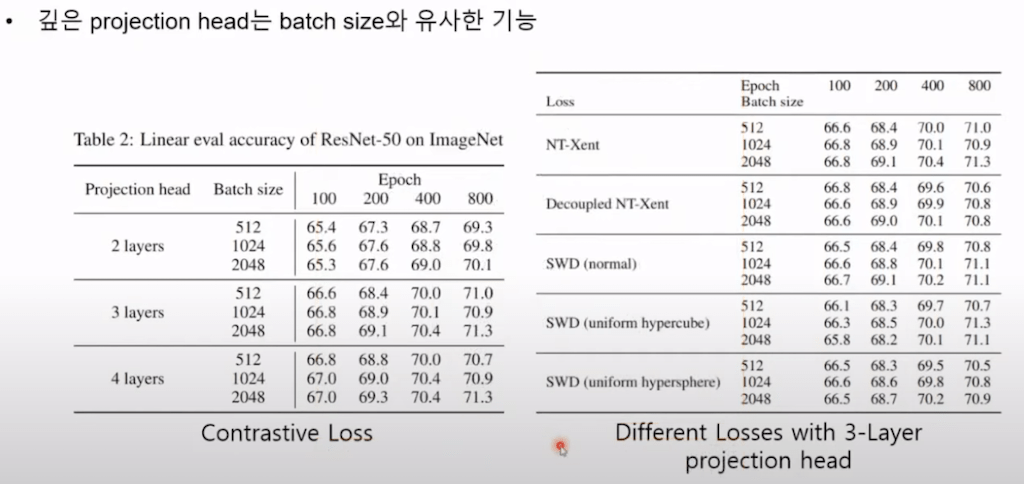 논문에선 깊은 projection head를 사용하는 것은 큰 배치 사이즈를 사용하는 것과 유사한 기능이 있다고 설명합니다.