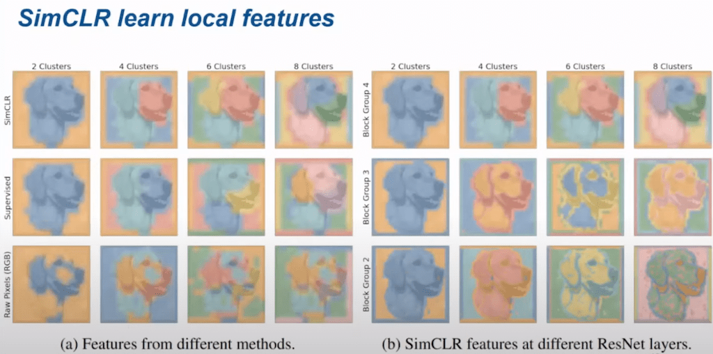 결과입니다. 왼쪽 그림 (a)는 SimCLR 그리고 supervised learning 그리고 raw pixel에 대해서 K-means로 clustrering 한 결과입니다. K값은 2, 4, 6, 8이 사용되었고 K 값이 커질수록 SimCLR랑 supervised learning 둘 모두 다 개의 얼굴 부위에 따라 grouping이 잘되는 것을 확인할 수 있습니다. 즉, SimCLR와 supervised learning 모두 local feature들을 학습한다는 의미입니다.