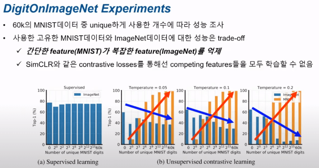 실험은 DigitOnlmageNet 데이터셋을 만들 때 총 6만 개의 MNIST 데이터셋 중에서 몇 개의 유니크한 MNIST 데이터셋을 가지고 합성을 했느냐에 따라서 성능을 측정을 했습니다. (a) 그림 supervised learning 같은 경우에는 lmageNet에 대한 정확도가 사용한 MNIST의 개수에 영향이 거의 없는 것을 확인할 수 있습니다. 반면에 그림 (b)는 MNIST 데이터 개수가 많아질수록 MNIST에 대한 정확도는 높아지지만 lmageNet에 대한 성능은 점점 감소하는 trade-off가 발생을 하게 됩니다. 이를 통해서 두 가지를 알 수가 있습니다. 첫 번째는 MNIST의 간단한 feature가 lmageNet의 복잡한 feature보다 우선해서 학습이 되면서 lmageNet의 feature가 학습된 것을 억제한다는 것, 두 번째는 SimCLR 같은 Contrastive loss를 통해서는 이러한 competing feature 간 trade-off가 존재해서 두 종류의 feature에 대해서 동시에 학습할 수가 없다는 것입니다.