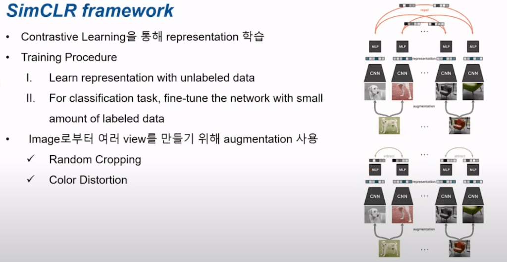 같은 이미지로부터 Augment 된 데이터, 즉 positive pair끼리는 서로 가까워지도록 학습이 됩니다. 밀어내고 가까워지는 것을 정의하는 metric 같은 경우는 Euclidian distance가 될 수도 있고 Cosine similarity가 될 수도 있습니다.