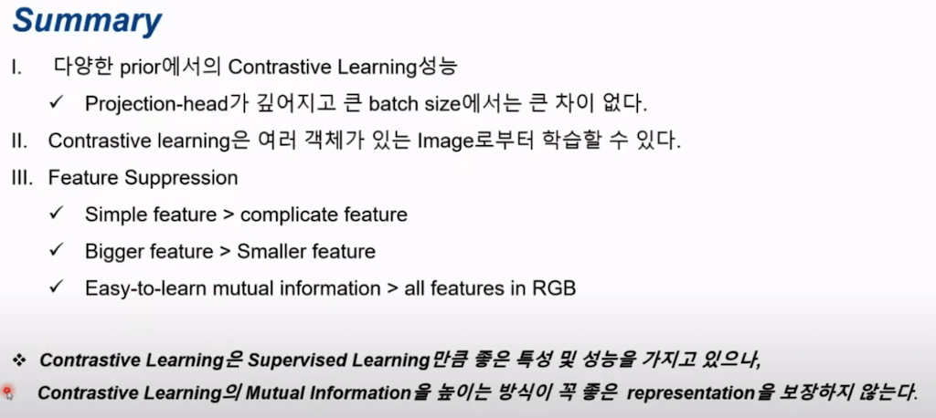 종합해서 정리를 하면 Contrastive learning은 label 정보가 없음에도 불구하고 supervised learning처럼 좋은 특성을 가지고 있습니다. 그러나 Contrastive learning의 Mutual Information을 높이는 학습 방법이 꼭 좋은 representation을 학습한다고 말할 수는 없다 라는 것이 이 논문의 요지입니다.