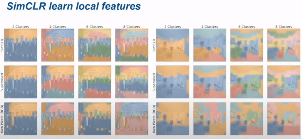 다른 예시로 COCO 데이터셋에 대한 clustering 결과입니다.(a), (b) 그림 모두의 경우에서 SimCLR랑 supervised learning 둘 다 객체 클래스에 따라 잘 묶이는 것을 볼 수 있습니다. (a) 그림 같은 경우에는 사진이 배경, 사람의 얼굴, 사람의 상의, 하의 이렇게 파트에 따라서 잘 묶여있는 것을 볼 수 있고 (b) 그림에서도 집안의 가구 종류에 따라서 grouping이 된 것을 확인할 수 있습니다.