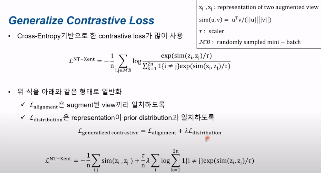 Contrastive loss들의 성능 비교입니다. Contrastive loss는 보통 첫 번째 식과 같이 Cross-Entropy를 기반으로 한 loss가 많이 사용이 됩니다. 먼저 alignment loss를 minimize 하는 것은 Augment 된 view끼리 일치하도록 해 주고, distribution loss는 representation이 prior distribution과 일치하도록 해줍니다. 따라서 Contrastive loss 형태를 아래에 있는 식과 같이 바꿔줄 수가 있습니다.
