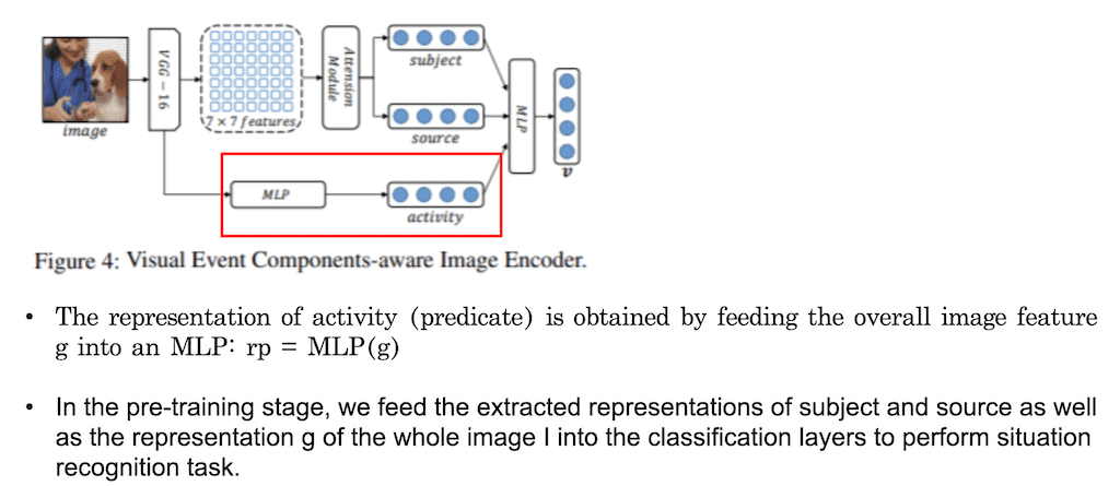 그리고 subject와 source와는 다르게 이미지에서 행위하는 activity 즉, 동사에 해당하는 단어는 이미지 전체를 보고 이미지 흐름을 이해해야 알 수 있는 부분이기 때문에 global image Vector 자체를 MLP에 넣어서 activity Vector를 뽑아줍니다. 이렇게 총 세 개를 뽑고 각각을 classification 해주는 Pre-training 단계를 거치게 됩니다. 여기서 subject는 수의사이고, source는 강아지, activity는 CLIPPING. classification 과정을 통해서 모델을 학습시킵니다.