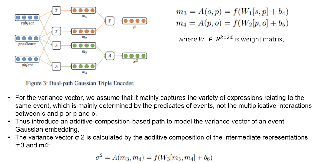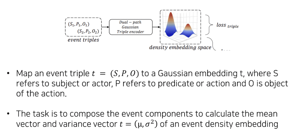 논문의 방법론입니다. 먼저 event triple을 어떻게 Embedding을 하느냐에 대해 설명을 드리도록 하겠습니다. event triple을 매핑하고자 하는 하나의 목적은 input으로 event triple이 주어, 동사, 목적어 세 개의 triple이 들어왔을 때 하나의 Gaussian distribution으로 표현합니다. Gaussian distribution으로 표현하기 위해서는 distribution의 평균과 표준편차를 알아야 합니다. 그래서 input이 triple로 들어오고, input에 대한 output은 하나의 distribution에 대한 평균과 표준편차를 구하는 모델을 학습을 시키게 됩니다.