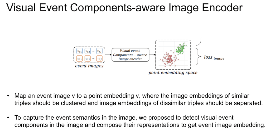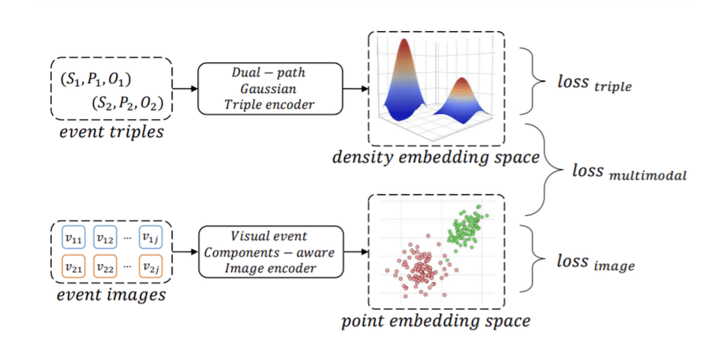 Visual event를 Embedding 하기 위한 방법입니다. Text는 하나의 distribution과 매핑시키고 이미지는 하나의 포인트와 매핑시켜서 이미지의 distribution이 하나의 triple의 distribution과 같은 사건에 다루는 경우에 2개가 비슷한 분포를 띄도록 학습을 시킵니다.