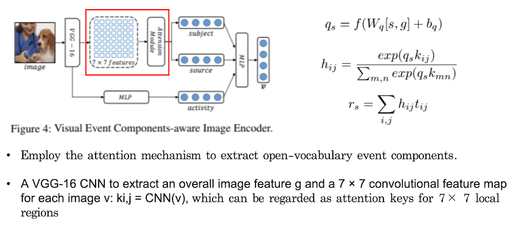 주체가 있고 객체가 있으려면 이미지의 어떤 object들이 존재해야 되기 때문에 주체의 주어와 목적어에 해당하는 것을 추출을 할 때는 이미지의 global Vector를 먼저 한번 추출을 하고 CNN을 통해서 local feature들을 다 뽑은 다음에 attention module을 적용한 다음에 뽑아냅니다. 처음에 이미지를 VGGnet을 사용해서 글로벌 Vector를 하나 뽑아내고 7 x 7 Convolutional feature map을 사용을 해서 local feature들을 뽑아냅니다. 뽑아낸 local feature에 대해서 subject 따로 source 따로 해서 attention module을 적용해서 subject를 찾으려면 이미지에 있는 수의사한테 attention을 줘야 합니다. 그래서 이 attention을 계산을 해서 subject를 뽑아내고 강아지를 뽑아내기 위해서 또 다른 attention moule을 적용해서 source를 뽑아내고 subject와 source를 Embedding을 시켜 줍니다.