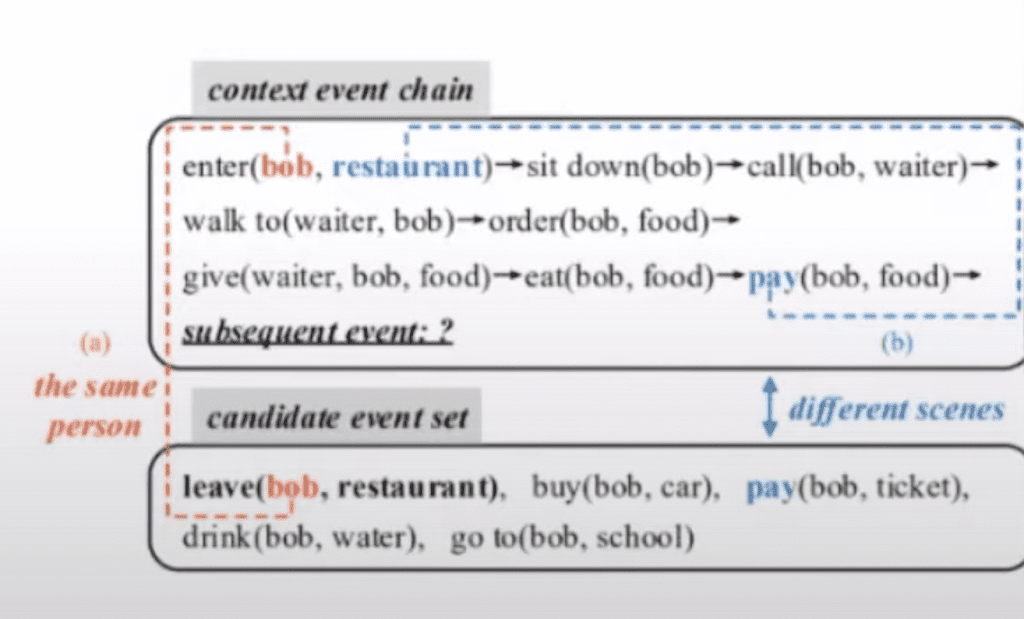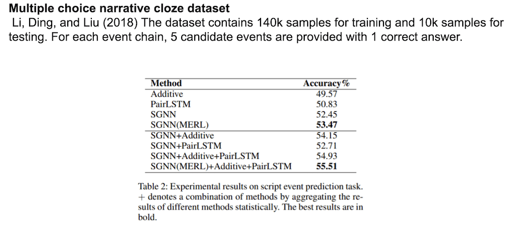 두 번째 task는 Script evenct prediction입니다. Script evenct prediction는 하나의 대본에서 다음 장면이 뭔지를 예측하는 task입니다. 예를 들어서 레스토랑에 가서 앉아서 직원을 호출하고 먹고 그리고 마지막에 돈을 지불 한 다음에 레스토랑을 나갑니다. 그리고 이어질 event가 무엇이냐를 예측하는 task입니다. Script evenct prediction는 기존에 task에 최적화된 classification 모델을 사용해서 Embedding만 MERL로 대체해서 Embedding이 얼마나 성능을 높일 수 있는지를 체크한 실험입니다.