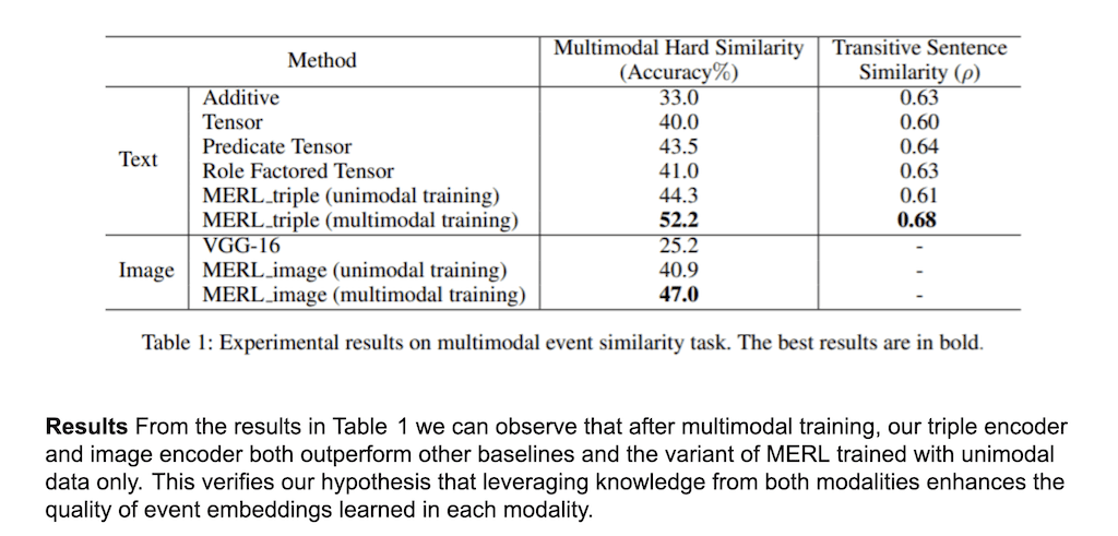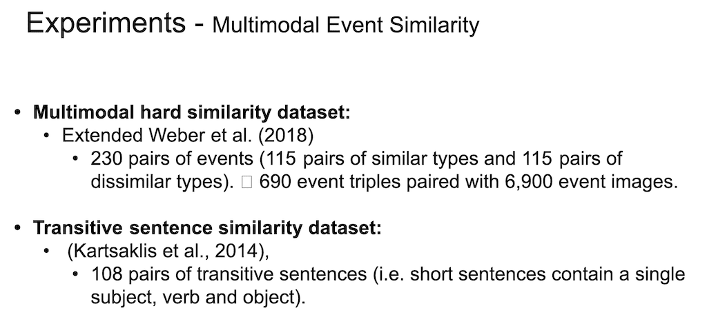 그래서 첫 번째 Multimodal event similarity는 같은 event를 다루고 있는 다른 이미지를 가지고 같은 event 인지를 찾는 task입니다. 두 번째는 이미지와 그리고 sentence에 대해서 비슷한 event인지 아닌지를 scoring 하는 task입니다.