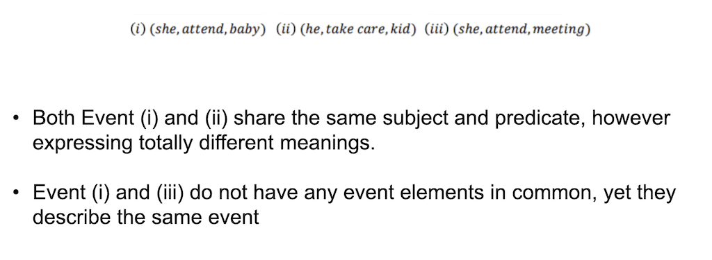 3가지 다른 event에 triple입니다. 여기에서 1번과 3번 triple을 보시면 (she, attend) 까지는 같은 단어가 쓰였습니다. 그런데 이 attend라는 단어가 의미하는 게 다르게 됩니다. 첫 번째는 돌보다 라는 의미의 attend고, 세 번째는 참석하다 라는 의미의 attend입니다.