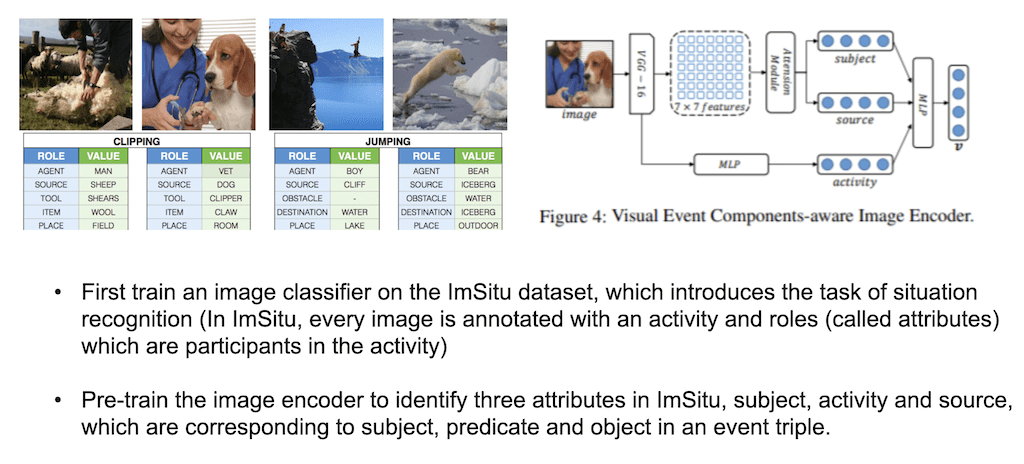 먼저 이미지를 Embedding을 시키고 주어, 목적어, 동사 이 세 개를 뽑아내기 위해서 Pre-training을 시켜주는 과정을 거칩니다. Pre-training에 사용한 데이터셋은 ImSitu 데이터셋을 사용을 해서 Pre-training 시켜줍니다. ImSitu는 사진이 하나 있고, 사진에서 다양한 역할들에 대한 value를 가지고 있습니다. 예를 들어서 첫 번째 사진을 보시면 한 남자가 양의 털을 깎고 있는데 activity 자체는 ‘깎는다’ 동사가 되고, Agent는 man이 되겠고 목적어(source)는 sheep이 되겠고 여러 가지 ROLE에 대한 value를 가지고 있는 데이터셋입니다.