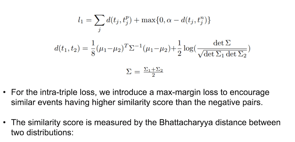 마지막 세 번째 loss는 triple의 Gaussian distribution과 그리고 triple에 해당하는 여러 개 이미지가 있을 텐데 이미지가 띄고 있는 distribution의 kl divergence loss를 구해서, 두 개 distribution이 유사하도록 학습을 시켜줍니다. 그래서 총 3개의 loss가 적용이 됐습니다.