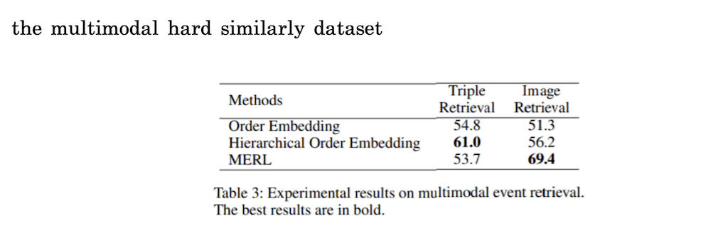 마지막 실험입니다. 이 실험은 event, triple이 주어지면 가장 유사한 이미지를 찾아 주는 task입니다. 일종의 구글 이미지 검색 이랑 비슷하다고 보시면 됩니다. 여기서는 recall@10 결과를 사용을 해서 스코어를 측정했습니다. 그리고 비교한 대상들은 텍스트와 이미지의 선후관계를 사용을 해서 Embedding을 시키는 모델들이라고 설명합니다. 그래서 하나는 triple을 넣고 비슷한 triple을 retrieval 하는 것, 그리고 triple을 넣고 비슷한 이미지를 retrieval 하는 것. 이 두 가지 task를 봤을 때 이미지 retrieval에서 압도적인 성능을 보인 걸 확인할 수가 있지만 triple retrieval에서는 다소 떨어지는 성능을 보였습니다.