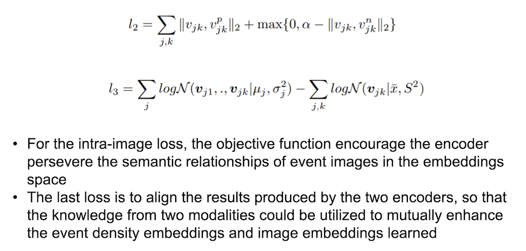 Training 과정입니다. 첫 번째는 triple을 encoding 하는 loss를 적용해주고, 이미지를 Embedding 하는 loss를 적용을 해 주고, 그리고 최종적으로 이 두 개의 다른 공간을 매핑하는 loss. 총 3가지 loss가 적용이 됩니다. triple에 대한 loss로는 max-margin loss를 사용합니다. 비슷한 event인 것과 similarity를 계산했을 때 높아야 되는걸 positive sample이라고 하고, 전혀 다른 event의 Embedding Vector와 similarity를 계산을 했을 때 similarity는 작으니까 비슷한 event끼리 similarity는 높고, 다른 event끼리 similarity는 낮게 max-margin loss를 줘서 학습시키는데 이때 triple은 event 하나를 distribution에 매핑하기 때문에 앞서 구한 Gaussian distribution의 평균과 표준편차를 이용해서 두 개 distribution 간의 유사도를 구해주게 됩니다. loss를 낮추는 방식으로 학습이 진행이 되게 됩니다.