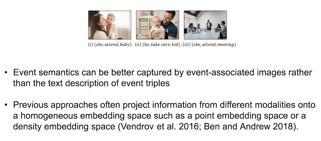 Multimodal을 사용을 하는 방식입니다. Multimodal은 triple + event에 관련된 이미지를 같이 Embedding을 하면서 Embedding의 정확도를 높여주는 학습법이 제안이 돼 왔습니다. 위에서 보여드린 세 개의 triple에 대해서 각각 그 사건을 나타내는 이미지를 같이 학습에 사용하게 함으로써 모델의 성능을 높이는 접근법이 발달을 해왔습니다.