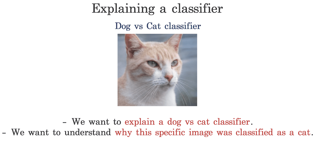 Explaining a classifier를 설명드리겠습니다. 위 사진을 보시면 고양이인지 개인지 classifier가 0 또는 1로 분류하는 경우가 있습니다. 개와 고양이 분류에서 개인지 고양인지에 대한 결정은 이미지에서 다양한 특성에 따라서 결정될 수가 있습니다. 예를 들어서 여기에 있는 눈 모양이 될 수도 있고, 쫑긋한 귀가 고양이로 분류되는데 특성이 될 수가 있습니다. 하지만 이 본 논문에서는 왜 특정한 이미지가 고양이로 분류가 되었는지 이해할 필요가 있고 결과에 영향을 미치는 특성들을 발견하고 이를 시각화할 필요가 있다고 말하고 있습니다.
