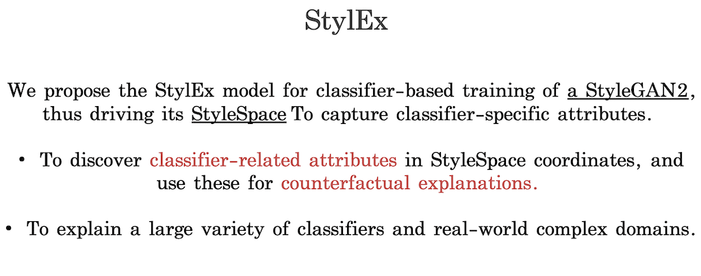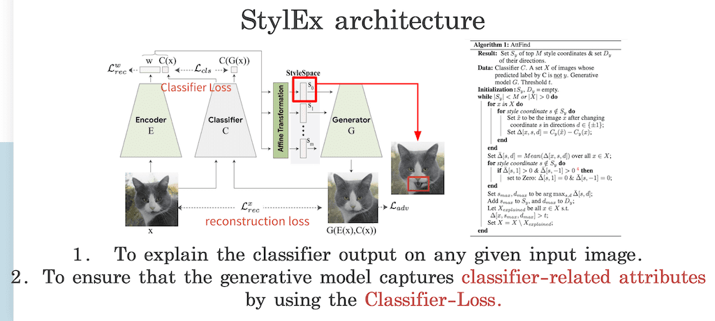 특정 이미지가 주어졌을 때 어떻게 영향을 미치는 특성들을 찾고, 이를 설명으로 시각화할 수 있는지 StylEX 구조에 대해서 말씀드리겠습니다. 가장 먼저 한꺼번에 아니라 각각의 특성을 찾기 위해서 stylegan2 구조를 baseline으로 사용하였고 이때 각각의 특성들을 뽑는 데 사용할 수 있는 StyleSpace를 사용합니다. 그림을 보시면 기존의 GAN 트레이닝 과정을 토대로 하고 있지만 이 StyleSpace가 classifier에 특성화된 특성들을 좀 포함할 수 있도록 stylegan2를 수정한 구조라는 것을 볼 수 있습니다. 기존에 GAN는 generator G 하고 discriminator d 가 동시에 학습이 되는데 논문에서 제시하는 방법은 추가적으로 reconstruction loss를 사용을 해서 Encoder E에서 generator G와 함께 트레이닝시키는 단계가 포함되어 있습니다. 그리고 또 중요한 부분은 트레이닝 과정의 Classifier를 통합한다는 것입니다. 구조를 StylEX를 통해서 분류기에 특정된 특성들을 포함할 수 있도록 generative 모델을 학습한다 설명합니다.