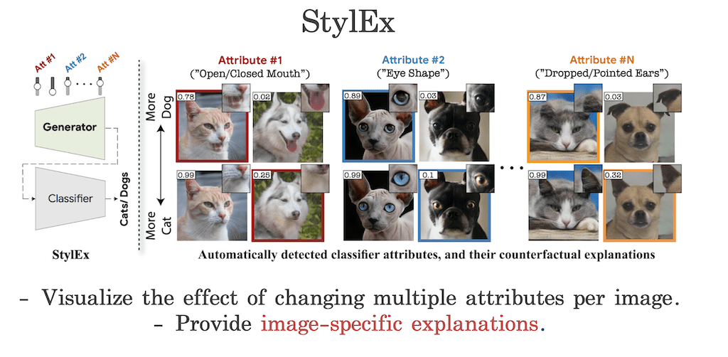 StylEX 논문은 분류기에 대한 설명을 새로운 접근법을 제시한 논문입니다. 위 그림을 보시면 다양한 특성들이 있게 되는데 다양한 특성들을 변화시키면서 그에 따른 결과를 시각화하고, 이를 통해서 이미지에 특성화된 설명을 제공하는 방법이라고 설명합니다.