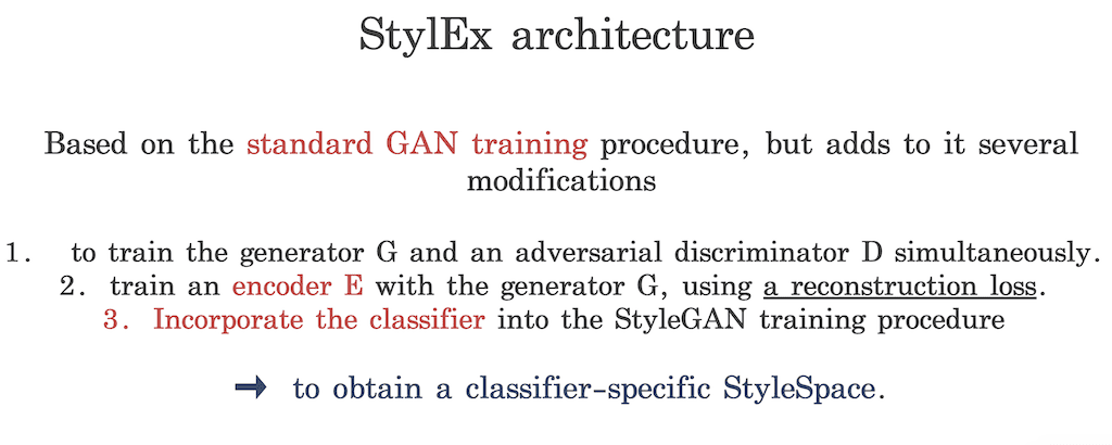 논문에서는 기존의 GAN 트레이닝 경우에 classifier를 통합하지 않기 때문에 classifier의 결정에 영향을 미치는 중요한 특성들을 나타내지 못할 수 있고 StyleSpace의 경우에는 불필요한 특성들까지도 나타낼 수 있다는 문제점을 제기하였습니다. 이를 극복하기 위해서는 StylEX 구조가 트레이닝 과정에서 classifier 모델을 통합하였고 이를 통해서 classifier specific 한 특성들을 찾는다라고 설명합니다.