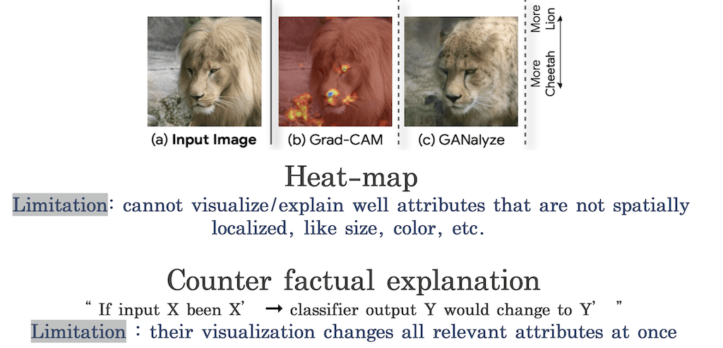 이전에 classifier를 설명할 때 접근 방법으로는 Heat-map과 같은 방법을 사용하였습니다. (b) 이미지를 보시면 중요한 이미지들이 하이라이트 되어서 한눈에 봐도 눈과 같은 부분이, 하이라이트 된 곳이 분류에 영향을 미친다는 것을 쉽게 알 수 있습니다. 하지만 더 세밀하게 눈의 사이즈가 영향을 미치는지, 아니면 눈의 동공 크기가 영향을 미치는지, 또는 눈의 모양인지 이렇게 눈의 무엇이 분류하는데 영향을 미치는지까지는 설명할 수 없다는 한계점을 가지고 있습니다. 즉, 이전에 attention map을 포함해서 (b) Grad-CAM 같은 방법들은 어떤 부분이 변화해야 되는지는 볼 수 있지만 이 부분에 어떻게 변화가 되어야 되는지는 설명할 수 없다는 한계점을 가지고 있습니다.