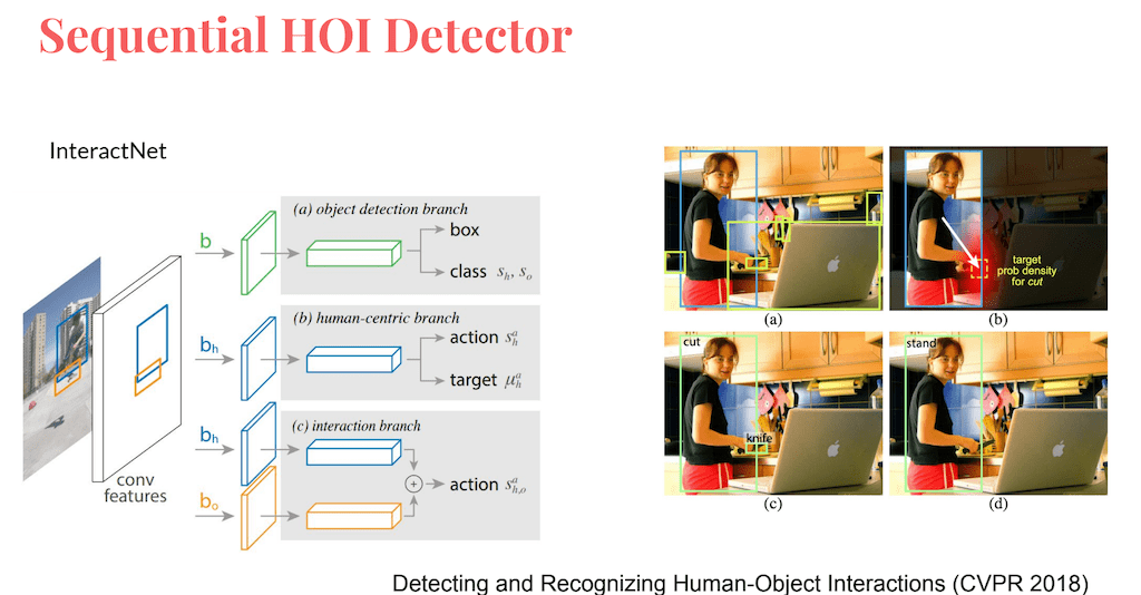 또 다른 Sequential HOI detector의 대표적인 예로는 InteractNet이 있습니다. InteractNet은 하나의 이미지에 사람과 물건이 있을 때 어떠한 액션 interaction을 취할지 예측할 수 있는지, 또한 한 이미지 안에 한 사람이 여러 물건과 interaction 할 경우 그 물건들을 어떻게 찾을 것인가에 대한 문제점을 제시하고 이에 대한 해결 방법을 제시했습니다. InteractNet의 저자는 새로운 InteractNet이라는 네트워크를 제시하면서 InteractNet을 통해 Triplet마다 Triplet 스코어를 구하며, 이 Triplet 스코어가 높은 것에 대해 이미지에 bounding box로 나타냈습니다. InteractNet의 구조는 총 세 개의 branch로 구성되어 있으며, 각각 Object, Human Centric, interaction branch입니다. 위 그림에서는 각각 parallel 한 게 아니라 가장 Sequential 한 방법으로 이루어졌다고 설명합니다. InteractNet은 세 가지 branch에서 얻은 Loss function의 합을 이용할 Triplet을 결정 하합니다. Sequential HOI detector는 직관적인 파이프라인을 가졌다는 장점은 있지만 Pairwise Neural network를 사용하기 때문에 시간이나 계산비용 측면에서 비효율적이라는 단점이 있습니다.