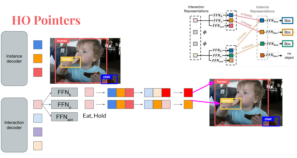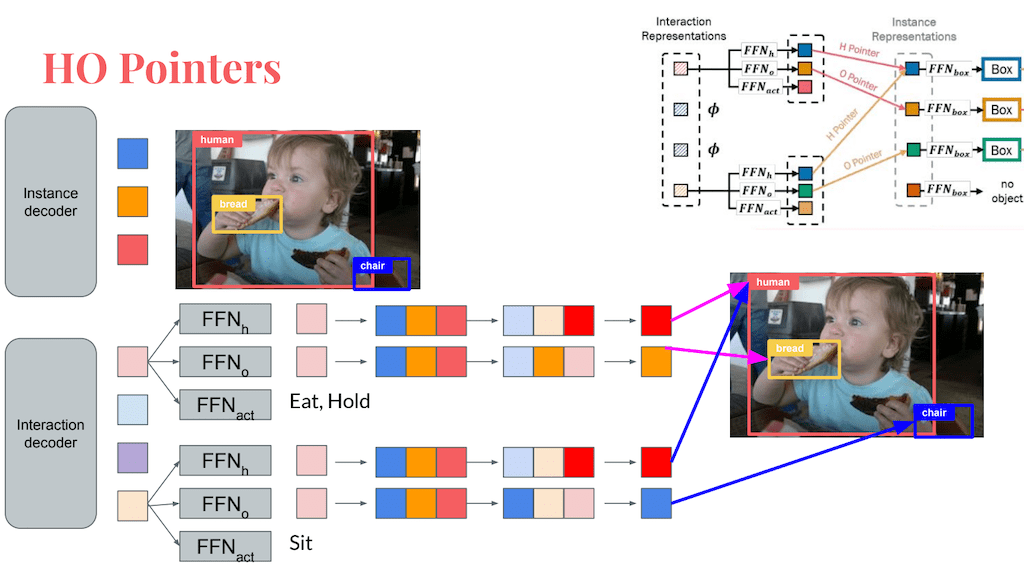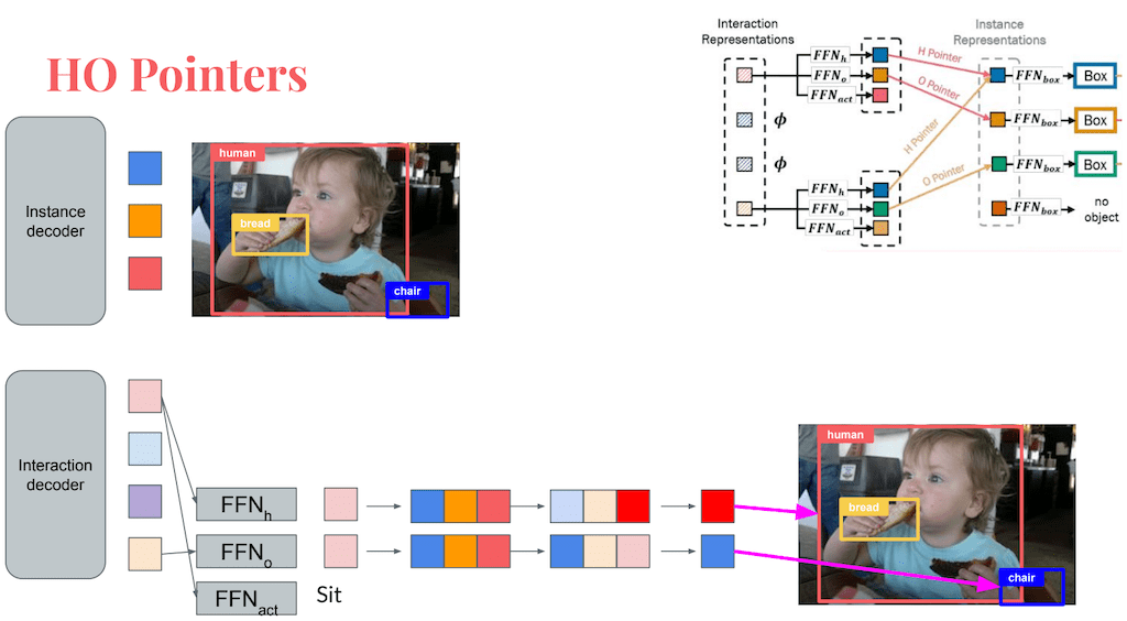 interaction decoder에 각각의 네 개의 결과가 나왔다고 했을 때 첫 번째 representation에 대해서 FFN를 Human, Object, action에 대해서 각각 수행하고, 이 수행된 결과를 instance decoder에 있는 파란색, 주황색, 빨간색과 각각 유사도를 매칭을 하게 됩니다. 그러면 유사도가 가장 높은 하나의 representation이 빨간색으로 가장 높게 나온 것을 확인할 수 있습니다. 그 결과 박스에 편향이 되면은 Human은 이미지 안에 Human이라는 빨간색 박스를 가리키고 있다 해서 HO 포인트가 되고, 이와 동일하게 Object에 대한 FFN 결과에 representation는 bread라는 Object에 대한 결과를 나타냅니다.
