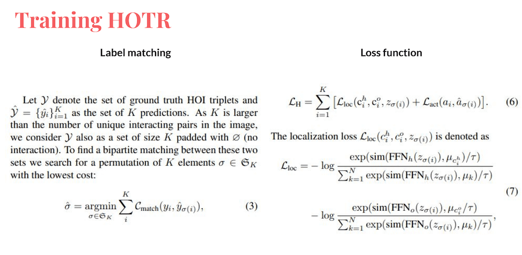 Training HOTR입니다. 좌측 수식에서 보면 Y는 K개의 Ground truth값이며, 이 K는 이미지 안에 있을 수 있는 최대 interaction 수 보다 크다고 정의를 하였습니다. Ground truth값인 Yi와 트레이닝 결괏값인 Y∑i를 매칭 하기 위해 K개 안에 순열을 (3) 수식을 이용하여 찾았습니다. Groundtruth와 예측값을 매칭 한 후 , 모든 매칭 된 pair에 대해 Hungarian 로스를 우측식과 같이 계산하고 HOI Triplet에 대한 로스식을 Localization 로스, action 로스, classification 로스를 합하여 계산하였습니다.
