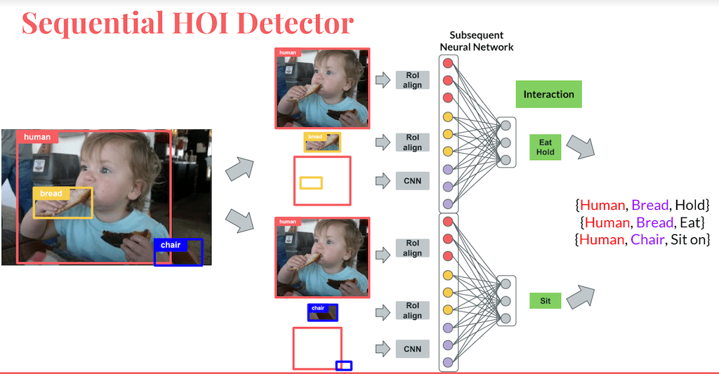 먼저 Sequential HOI detector는 한 이미지 안의 모든 물체를 탐지하고 모든 pair에 대해 Sequential 한 Neural network를 사용하여 interaction을 추론하는 방법입니다. 왼쪽에 Object detection 결과에서 모든 Human Object pair에 대해 Neural network를 적용하고 그 사이에서 상호작용을 찾는 방식입니다.