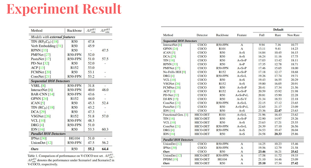 이전 구조들과의 차이점은 한 개의 decoder를 instance decoder와 interaction decoder 이 두 개의 Parallel 한 decoder를 사용했고, 또한 이 두 개의 decoder에서 나오는 결과를 합치기 위한 방법으로 HO Pointer라는 개념을 제안했습니다. 그 결과 Sequential 하거나 Parallel 한 detector의 단점인 post processing 과정을 제거할 수 있고, 성능 면에서도 몇몇 벤치마크에서 SOTA를 찍으면서 Inference 타임이 획기적으로 감소했다는 결과를 얻었습니다.