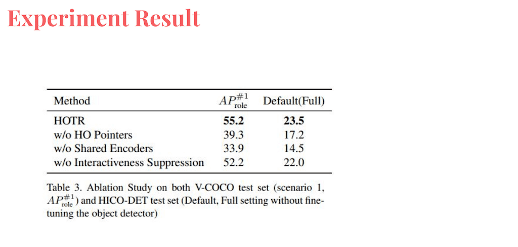 Ablation study입니다. 먼저 HO Pointer를 사용함으로써 직접적으로는 bounding box regression을 수행하는 것보다 관련 instance representation을 Pointer에 Localization 하였으므로 V-COCO 데이터셋에 대해서는 39.3에서 55.2로 16.7 AP 정도 성능 향상이 있었습니다. 또한 Interactiveness Suppression을 이용해 각 클래스를 독립적으로 처리하는데 Multi label 이진 분류를 적용하였습니다. 이를 통해 약 3AP정도 성능 향상을 나타냈습니다.