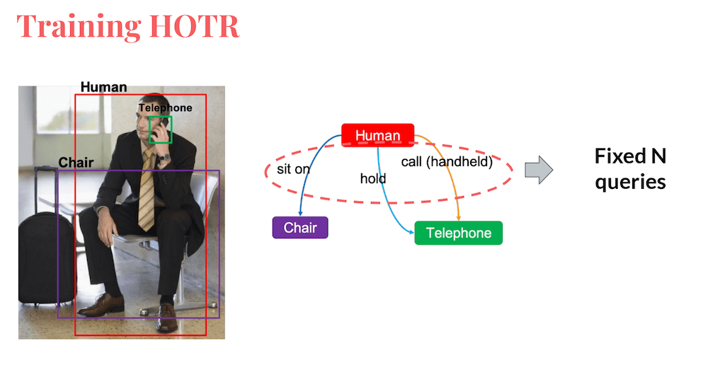Transforemr 구조를 가진 모델을 설계함으로써 set prediction을 가능하게 했으나 실제 데이터셋을 훈련하기에는 문제가 있습니다. 바로 하나의 이미지 안에 interaction 개수가 정해져 있지 않다는 것입니다. 하나의 이미지 안에 여러 가지 상호 작용이 있을 수 있으며, 이는 이미지마다 다르기 때문입니다. 이런 문제를 해결하기 위해 Hungarian알고리즘을 활용했습니다.