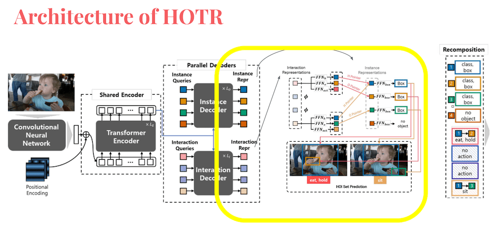 다시 HOTR의 구조입니다. 처음으로 인풋 이미지를 CNN backbone을 통해 처리된 feature map을 얻습니다. 또한 이 feature map은 positional embedding을 합쳐서 share decoder에 입력됩니다. 그다음 share encoder를 통해 이미지 내 전반적인 context를 반영하여 representation을 학습하게 되고, 이 encoder의 결과는 instance decoder와 interaction decoder에 각각 들어가며, 각각의 decoder에서 각각 representation을 학습하게 됩니다. 이 decoder의 결과인 instance representation과 interaction representation은 HO pointer라는 개념을 이용하여 짝지어 줍니다.