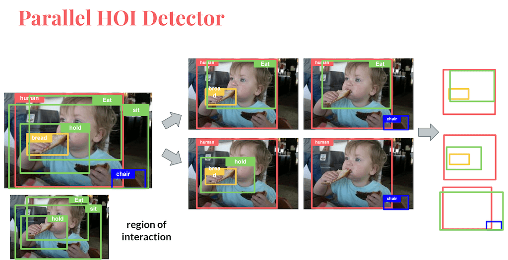 Parallel HOI detector는 2 스테이지의 Sequential HOI detector의 단점인 computation 코스트 비용 개선을 이루어내기 위해 제안되었습니다. Parallel 한 HOI detector는 기존의 모든 객체를 탐지한 후, Neural network를 이용하여 모든 Parallel interaction 스코어를 찾는 기존 방법을 Neural network 대신에 interaction 박스나 Union 박스를 이용하는 1 스테이지 방식으로 전환했습니다. 이는 성능을 유지시킴과 동시에 Inference 타임을 크게 감소시켰다는 장점을 갖고 있습니다.
