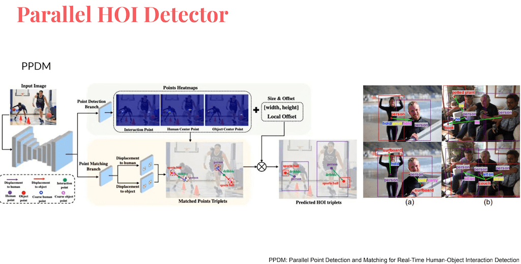 Parallel HOI detector의 예시인 PPDM입니다. PPDM은 키 포인트 히트맵을 적용한 연구입니다. 첫 번째 포인트 detection branch에서 센터 포인트와 이에 해당하는 사이즈를 찾습니다. 그리고 interaction 포인트로 사람의 센터 포인트와 물체의 센터 포인트 페어 간에 중간점을 사용합니다.