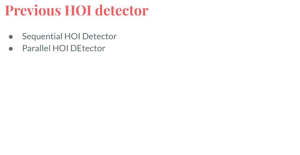 HOI에 대한 초기 방법론들은 우선 이미지 내에 모델 Object를 detection 한 뒤, Sequential 한 Neural network를 이용해 Human Object pair를 연관시키는 방식의 Sequential HOI detector와 Sequential HOI detector에 사용된 Neural network 대신에 interaction 박스나 Union 박스를 이용하여 1 스테이지로 Human Object pair를 연관시키는 방식인 Parallel HOI detector가 있습니다.